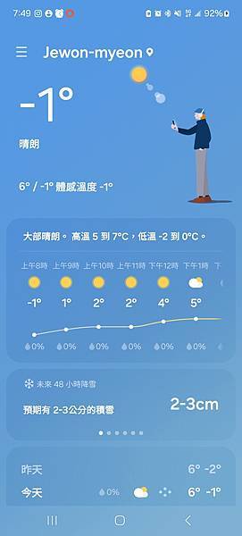 快要八點的時候看到微微的太陽出來,查了一下天氣竟然是-1度,心想 神啊這天氣真的是對的嗎? 氣象顯示都還是晴天,現在確實有太陽但怎麼還是在下雨,